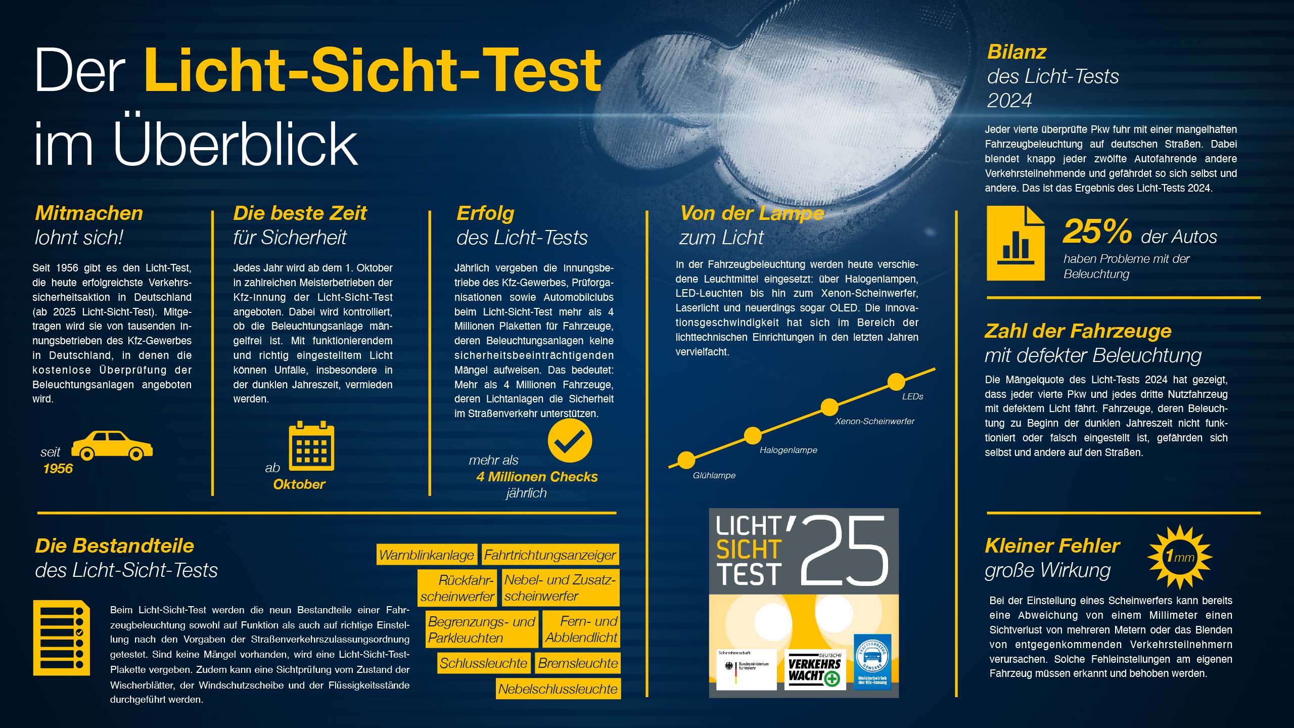 Der Licht-Test ist ein Service, bei dem Kfz-Meisterbetriebe kleine Licht-Mängel in der Regel sofort und kostenlos beheben. Nur notwendige Ersatzteile sowie umfangreiche Diagnose- und Einstellarbeiten müssen bezahlt werden. Die bundesweite Aktion gibt es bereits seit 1956, sie wird gemeinsam vom Kraftfahrzeuggewerbe und der Verkehrswacht organisiert.