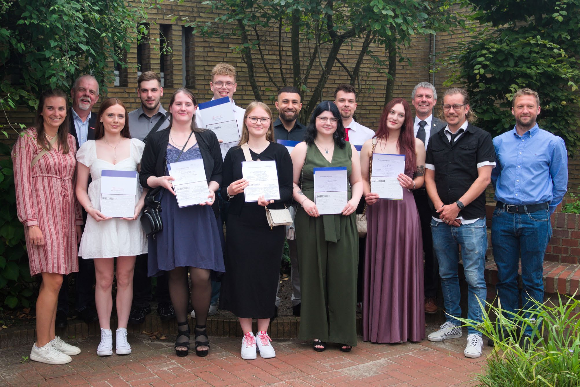Neben 9 frischgebackenen Gesellinnen und Gesellen stehen hier beim Gruppenbild auch Fachlehrein L. Leege, Fachlehrer F. Papke, Leiter der ÜA G. Neumann, Prüfungsausschuss Ph. Struve und Obermeister St. Struve.
